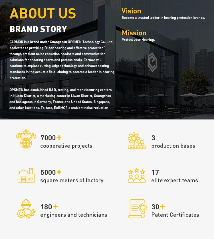 We founded the well-known "EARMOR" brand. Mainly product series are electronic noise reduction headphones/headsets, popular earmuffs, earplugs, PTT and some accessories. In addition, there are light series like the tactical flashlights,survival lights. They are mainly used in the shooting range, operations, training, outdoor hunting, tourism, airplane, sports and other fields for protection and assistance. Our products passed the following test items : ANSI, CE, AS/NZS ,EN352,FCC.